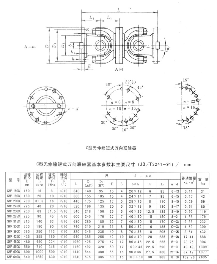 C型無伸縮短型萬向聯(lián)軸器基本參數(shù)和主要尺寸