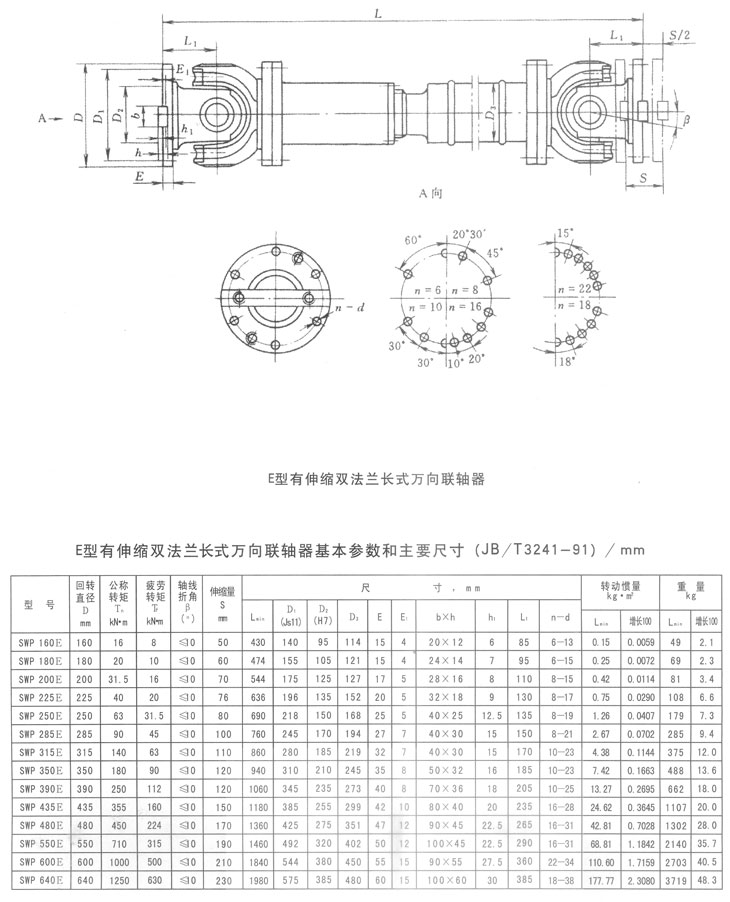 E型有伸縮雙法蘭長型萬向聯(lián)軸器基本參數(shù)和主要尺寸